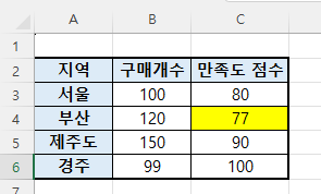아래 77점의 값을 찾기 위해서는 =vlookup(기준값, 범위, 열값,정확한 값일치) 의 값을 넣어야합니다.